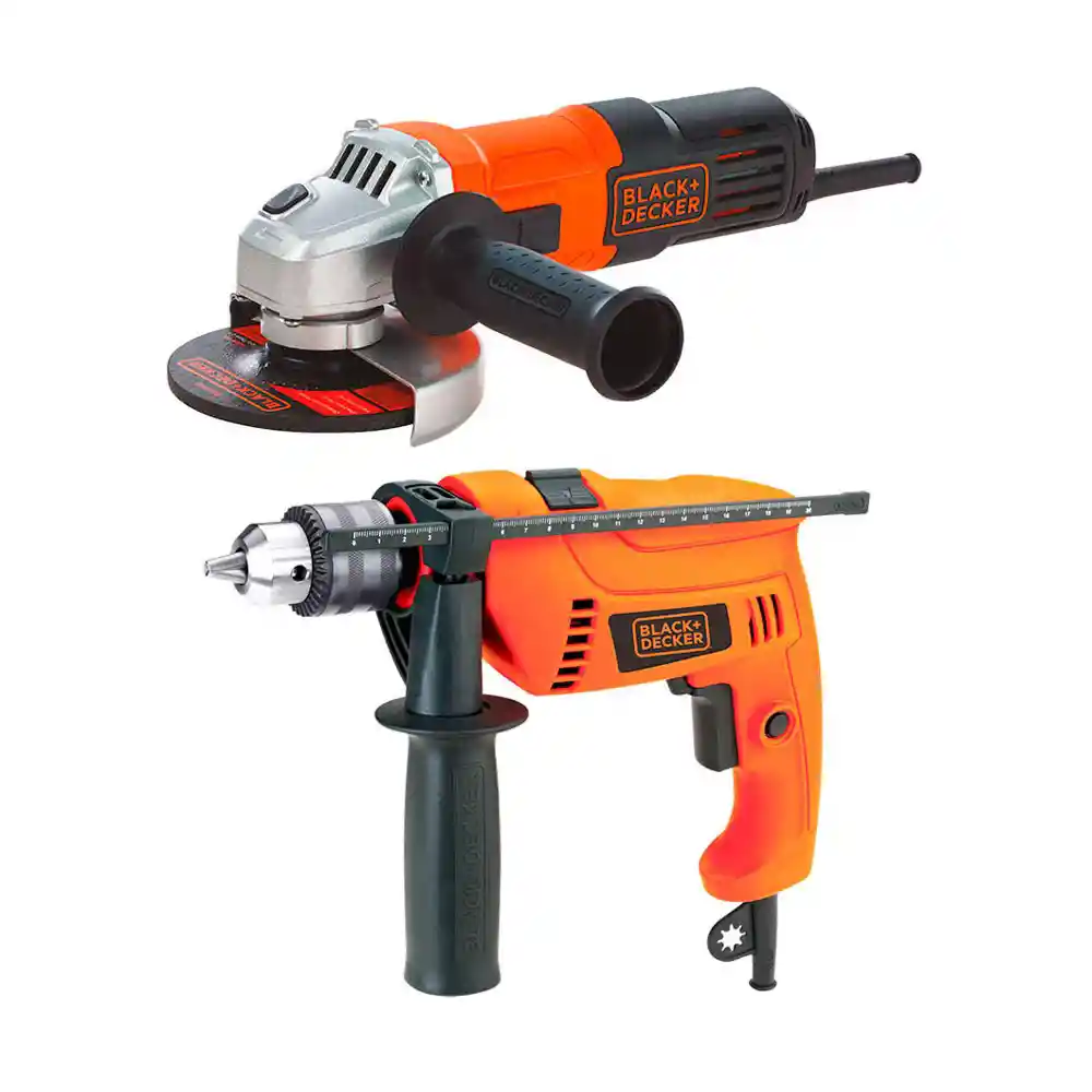 Kit Pulidora Angular Black and Decker G650-b3 + Taladro Percutor Black and Decker Hd555-b3 CARACTERÍSTICAS PULIDORA G650-B3: Potente motor de 650W Diseño compacto Traba de eje Seguro de eje para cambiar los accesorios de forma sencilla Mando de goma para un mejor control y comodidad. Empuñadura lateral de 2 posiciones Interruptor de sellado contra polvo con bloqueo para uso continuo Guarda de seguridad APLICACIÓN: Trabajo de metales Trabajo de madera Corte de azulejos ESPECIFICACIONES TÉCNICAS PULIDORA G650-B3: Potencia 650W Velocidad 12000/min (rpm) Eje 5/8" - 11/M14 Admite discos de 4" / 100 mm Frecuencia: 50/60 HZ Cable 2 metros CARACTERÍSTICAS TALADRO HD555-B3.: Potente motor de 550W Selector de percusión o rotación Mandril de 1/2" (13mm) Barra de profundidad Velocidad variable y reversa Interruptor con bloqueo para uso continuo ESPECIFICACIONES TÉCNICAS TALADRO HD555-B3.: Potencia: 550W Velocidad: 0 - 2800/min (rpm) Percución: 0 - 45000ipm (bpm) Mandril: 1/2" (13mm) Traba de gatillo: Si Cable: 1,8m Capacidad de acero: 1/2" (13mm) Capacidad de madera: 1-1/4" (32mm) Capacidad de Concreto: 1/2" (13 mm) INCLUYE: Taladro percutor HD555-B3. Empuñadura lateral. Barra de profundidad. Llave de mandril. Pulidora G650-B3 Empuñadura lateral Llave No incluye broca.