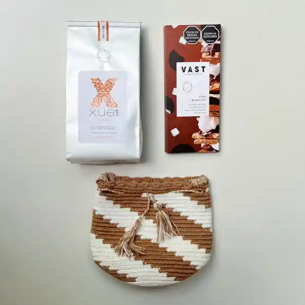 Regalo con Café Origen 227g, barra de chocolate y mochila artesanal. Tradición, sabor y diseño en un solo kit.