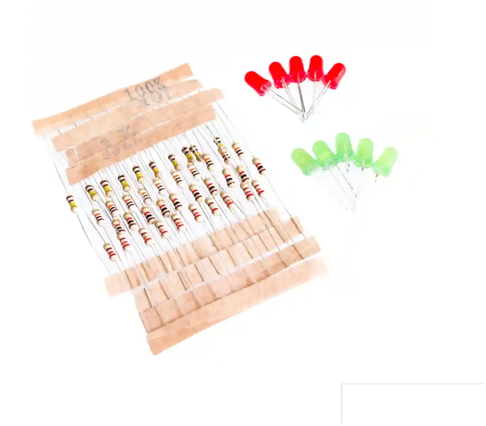 KIT RESISTENCIAS Y LEDS. 220 OHM X 10 PCS 1K X 10 PCS 10K X 10 PCS 100K X 10 PCS LED 5MM Rojo X 5 PCS LED 5MM Verde X5 PCS