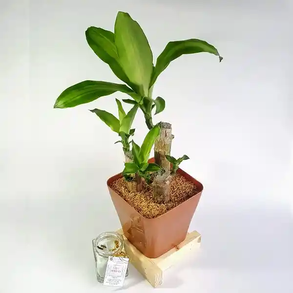 PLANTA TRONCO DE LA FELICIDAD EN MATERA PLÁSTICA COLOR DORAD0 DE 15CM*15CM, CON VELA ORGÁNICA DE ARMONÍA DE ALTO 8CM*ANCHO 6CM, UNA VARA DE PALO SANTO, INSTRUCCIONES PARA REALIZAR EL RITUAL.