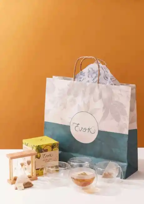 Set con infusión natural jengibre, piña y limón, 4 tazas de vidrio doble pared, reloj de arena y bolsa To Go. Bienestar y pausa consciente de Evok.