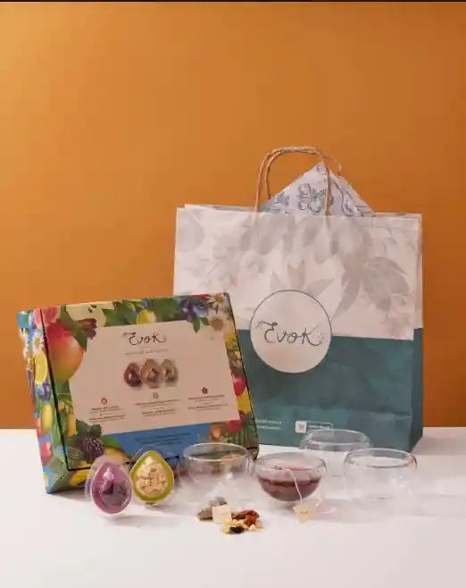 Set con 4 tazas de vidrio doble pared, estuche de infusiones surtidas x12 cápsulas y bolsa To Go. Ideal para compartir y regalar.