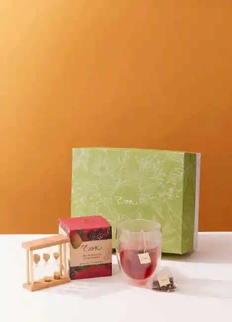 Set con vaso de vidrio doble pared, infusión jamaica, mora y mango (12 tisanas), reloj de arena y caja de regalo de Evok.