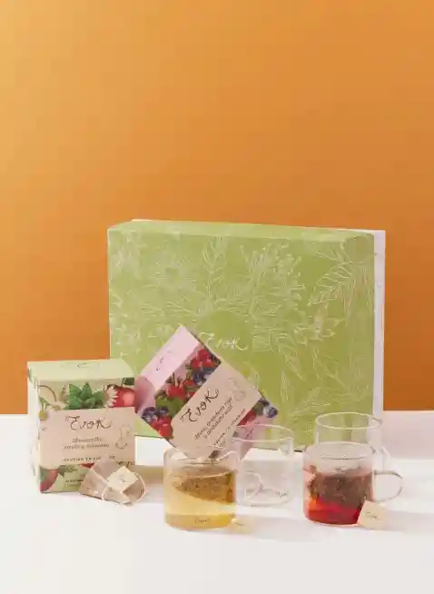 Set con 4 pocillos y 2 infusiones (manzanilla, hierbabuena y manzana + mora y arándanos) en 12 tisanas c/u. Incluye caja de regalo.