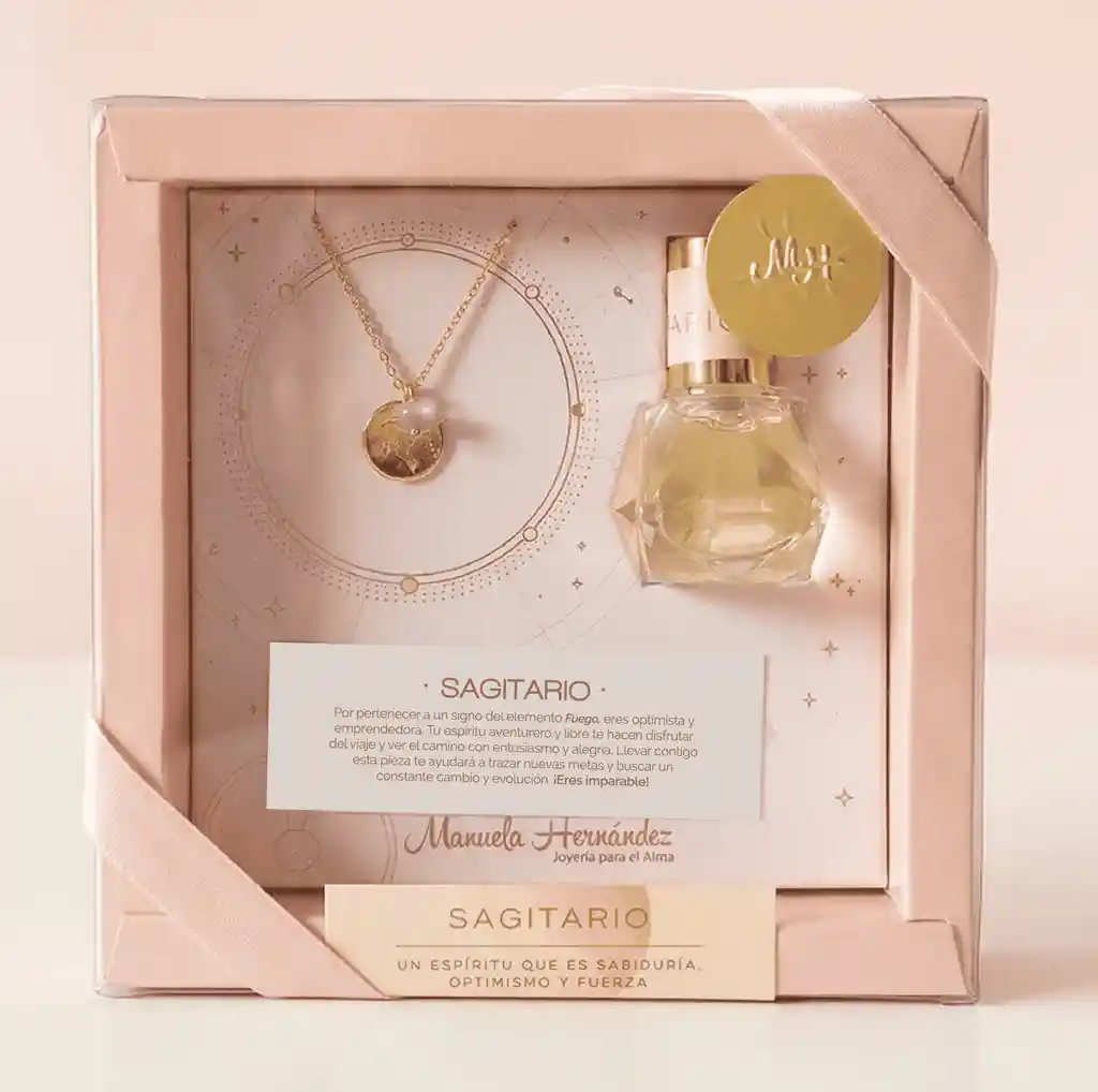 Ritual Zodiacal Sagitario🌙✨ Un tesoro con significado para conectar con tu energía o regalar: cadena bañada en oro 18K con la constelación de tu signo, cuarzo natural alineado a tu zodiaco y blend de aceites esenciales para intencionar, armonizar y atraer lo que deseas. 💫 ¿Qué trae tu Ritual? -Cadena bañada en oro 18K con dije de la constelación de tu signo zodiacal acompañado de un cuarzo natural que vibra con la energía de cada signo -Blend de aceites esenciales inspirado en tu zodiaco, para aromatizar, intencionar y llevar contigo siempre. (10ml)