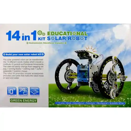 Kit Educativo de Robots Solares 14 en 1 Descripción: Crea 14 robots solares diferentes con este kit. Crea un cangrejo, una tortuga, un caracol y muchos otros robots inspirados en animales, o robots que se mueven como coches, andantes o barcos. Aprende sobre energía solar renovable y electrónica. ¡Muy divertido de construir con 201 piezas! No necesita pilas, genera su propia energía. Con 14 tipos diferentes de robots, este kit educativo te ofrece una gran variedad para elegir. Desde cangrejos y tortugas hasta barcos y modelos que se mueven, puedes construir una amplia gama de modelos con este kit de 201 piezas. Incluye un motor y engranajes para mover los robots, así que puedes elegir uno para construir y desmontarlo para construir otro y disfrutar de horas de diversión. Los kits se alimentan con luz solar: experimenta con luz solar directa, indirecta y luz artificial intensa y descubre la diferencia. Características: CONSTRUYE Y TRANSFORMA UN ROBOT - El kit educativo de robot solar 14 en 1 permite a tu futuro ingeniero construir un robot y transformarlo en 14 modos diferentes, con movimientos y diseños únicos. El robot puede transformarse de un escarabajo corredor a un bote de remos, un cangrejo andante o incluso un cazador de zombis. DESAFÍA Y APRENDIZA - Los niños curiosos se divertirán construyendo e interactuando con los 14 diseños y funciones diferentes del robot. Aprenderán sobre energía solar y robótica desde la comodidad de su hogar o aula, ¡mientras se entretienen! Este kit incluye instrucciones educativas y dos niveles de complejidad para la construcción del robot. ALIMENTADO POR EL SOL - Con el papel fundamental que desempeñan las energías alternativas, no hay mejor momento que ahora para que los niños comiencen a aprender los conceptos básicos de la robótica y las energías renovables. Afortunadamente, este producto funciona con energía solar, por lo que no requiere baterías. El robot se mueve con la luz solar directa y permite a los niños crear y usar su imaginación sin límites. FUNCIONA EN TIERRA O EN AGUA: El robot tiene modos que funcionan tanto en tierra como en agua. Algunos modos caminan o se arrastran, y otros flotan o nadan. Explora la mecánica y la ciencia en tu mesa, suelo, piscina o bañera. Cambia el entorno para que este juguete resulte interesante para tu hijo o estudiante. APRENDIZAJE STEM: Ciencia, Tecnología, Ingeniería y Matemáticas. En lugar de enseñar estas cuatro disciplinas como materias separadas, STEM las integra en un estándar de aprendizaje interconectado basado en aplicaciones del mundo real. Cada kit de robot para armar es un modelo funcional que demuestra conceptos STEM. Recomendado para mayores de 10 años. No apto para menores de 3 años debido a las piezas pequeñas. LA COMPRA INCLUYE: 1x KIT ROBOTICO SOLAR 14 en 1