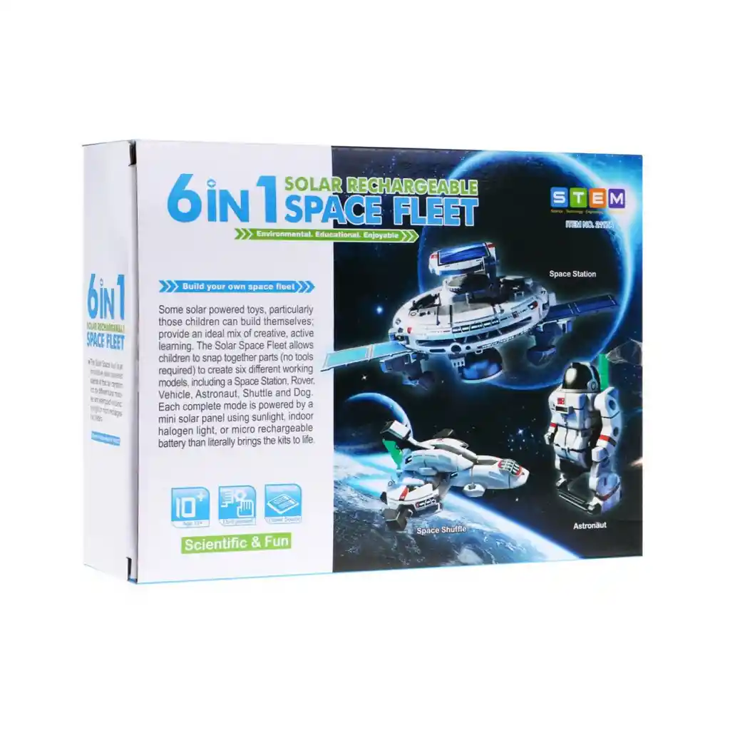 Flota espacial solar 6 en 1 Vehículos solares: un set 6 en 1. Este juguete educativo de autoensamblaje funciona con energía solar. No necesitas pegamento ni herramientas para armarlo. Las piezas se pliegan con un cierre. Este set solar es un juguete ideal para niños curiosos. Les permite pasar tiempo de forma creativa y, además, les enseña a aprovechar la energía solar. Primero, debemos ensamblar el módulo del panel solar y el motor. Los demás elementos se pueden modificar según la estructura que estemos armando. El set incluye una microbatería y un compartimento para pilas AAA (con dos pilas incluidas). Gracias a la microbatería, podemos cargar el vehículo en 3 minutos y usarlo durante 50-60 segundos en un lugar oscuro. Al cambiar el módulo de microbatería por un contenedor con 2 pilas AAA, podemos usar nuestro vehículo sin necesidad de exponerlo al sol, gracias a lo cual, incluso en días nublados, el niño podrá seguir disfrutando jugando con este juguete. El set permite a los niños aprender jugando, una forma natural de conocer el mundo, la más placentera y fácil para que aprendan. La creatividad que se despierta en ellos les será útil en el futuro. Dimensiones de la caja: aprox. 24 x 18 x 7 cm. Contenido: - Motor, - Panel solar, - Piezas de montaje, - Instrucciones de montaje ilustradas, - Microbatería. Modelos que se pueden construir Modelos que se pueden construir - Estación espacial, - Musgo espacial, - Perro espacial, - Astronauta, - Vehículo de investigación, - Coche espacial, - Transbordador espacial. Especificaciones Edad mínima: 10 años o más Color principal: Azul Efectos adicionales: No disponibles LA COMPRA INCLUYE: 1x KIT ROBOTICO SOLAR 6 en 1