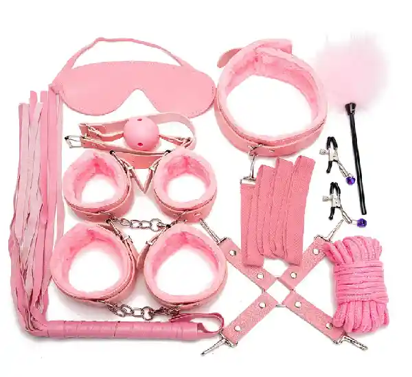Todos nuestros productos van totalmente discretos y anónimos. Embalados en caja o bolsa de seguridad sellada y sin transparencia. Características: Kit sadomasoquista 10 piezas para juego en pareja importado. Contiene: 1 Arnés en Cruz para Esposas. 1 Par de esposas de manos. 1 Par de esposas de tobillo. 1 Cuerda bondage. 1 Par de pezoneras. 1 Collar con correa. 1 Tapa ojos. 1 Mordaza. 1 Látigo. 1 Pluma. Material: Cuero & Poliéster. Juegue con cautela con cada uno de los artículos. Si su pareja se pasa de listo(a) comuníquese de inmediato con la línea de emergencia de la Policía Nacional 123 o con la línea antisecuestro del Gaula 165. Si está amarrado(a), ¡grite!