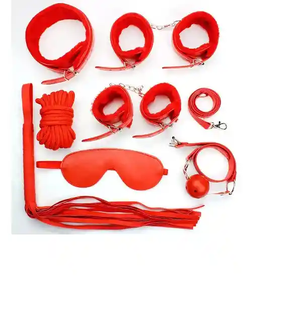 Todos nuestros productos van totalmente discretos y anónimos. Embalados en caja o bolsa de seguridad sellada y sin transparencia. Características: Kit sadomasoquista 8 piezas para juego en pareja importado. Contiene: 1 Arnés en Cruz para Esposas. 1 Par de esposas de manos. 1 Par de esposas de tobillo. 1 Cuerda bondage. 1 Par de pezoneras. 1 Collar con correa. 1 Tapa ojos. 1 Mordaza. 1 Látigo. 1 Pluma. Material: Cuero Poliéster. Juegue con cautela con cada uno de los artículos. Si su pareja se pasa de listo(a) comuníquese de inmediato con la línea de emergencia de la Policía Nacional 123 o con la línea antisecuestro del Gaula 165. Si está amarrado(a), ¡grite!