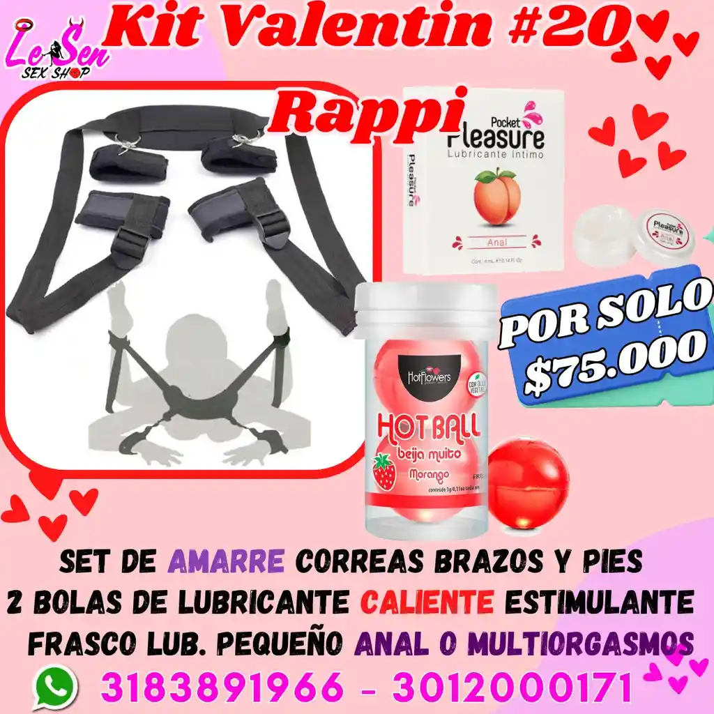 Éste kit incluye: SET DE AMARRE CORREAS BRAZOS Y PIES, Adaptable a cualquier talla 2 BOLAS DE LUBRICANTE CALIENTE ESTIMULANTE, Uso Vaginal FRASCO LUBRICANTE PEQUEÑO ANAL o MULTIORGASMOS Nota: Para dar modificación de colores de juguetes o un algún otro producto, escribir al chat de rappi después de hacer la compra