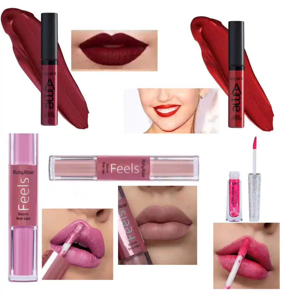 Incluye 5 labiales Matte: - LABIAL DUO LIPS FEELS 357 - Ame Labial Líquido Ultra Mate Scarlet 01 - RUBY ROSE SHINE KISSES GLITTER 367 MATTE - Ame Labial Líquido Ultra Mate Miranda - RUBY ROSE LABIAL DUO LIPS FEELS 360