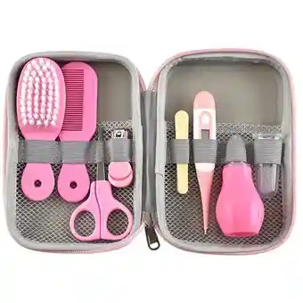 Kit para bebe de 8 piezas con cartuchera Incluye: *Cepillo para el cabello de cerdas suaves *Peinilla para el cabello *Extractor nasal con punta de silicona blanda *Termómetro digital con punta flexible *Cepillo bucal para utilizar con dedo en silicona con masajeador *Cortaúñas para bebe *Tijeras con punta redonda para las uñas *Lima especial para uñitas delicadas