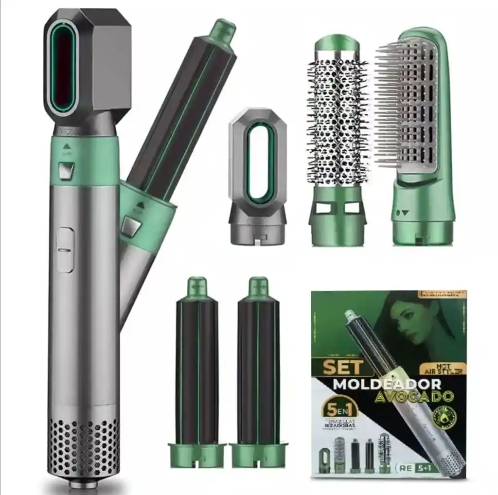 El Cepillo Moldeador 5 en 1 Aguacate 1.1 es más que un simple secador. Es un sistema de peinado integral que te permite secar, alisar, rizar y dar volumen a tu cabello con resultados de salón, sin salir de casa. Diseñado para mujeres modernas que valoran el tiempo, la calidad y el cuidado capilar. Transforma tu rutina con sus múltiples funciones: Volumen en segundos: El cabezal voluminizador eleva el cabello desde la raíz sin esfuerzo. Secado inteligente: El cepillo de aire caliente seca mientras peina, evitando daños por calor excesivo. Masaje relajante: El cabezal masajeador activa la circulación sanguínea y favorece un cuero cabelludo saludable. Rizos duraderos: Crea rizos definidos o ondas naturales sin necesidad de herramientas adicionales. Alisado impecable: Logra un acabado liso, brillante y libre de encrespamiento. Ventajas de su tecnología de flujo de aire: Alta velocidad con boquillas diseñadas para direccionar el viento con precisión. Distribución uniforme del calor que evita puntos calientes y protege la fibra capilar. Iones negativos que neutralizan la electricidad estática y mejoran la textura del cabello. Diseñado para tu comodidad: Cabezal principal liviano y ergonómico Sistema de acoplamiento magnético o de clic rápido (dependiendo del modelo) Fácil almacenamiento y transporte Datos técnicos clave: Voltaje: AC110V/220V, 50-60Hz Potencia: 1000 W Temperatura máxima: 105 °C Modos: aire frío fuerte, aire caliente bajo (x2), aire caliente fuerte (x2) Contenido del empaque: 1 tubo de aire caliente principal 5 cabezales funcionales 1 manual de usuario uso