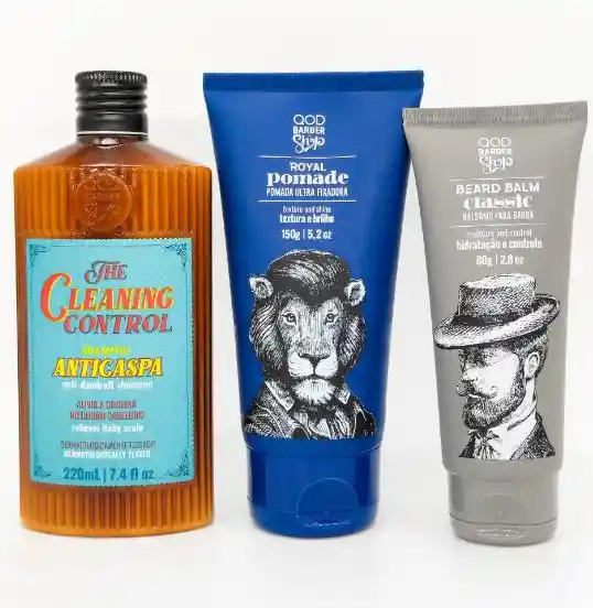 "El Shampoo Hombre Anticaspa, tiene el doble de activos que el promedio de shampoos anticaspa. Funciona como 3 en 1 – Protector anti-caspa, anti-picor y peeling. QBS The Cleaning Control Shampoo fue desarrollado con ingredientes que combaten la caspa y la picazón del cuero cabelludo. Con aceite de árbol de té, reduce la grasa de la piel, además de contener un complejo formulado a partir de extractos de plantas que combaten y previenen la descamación excesiva del cuero cabelludo. Resultados probados por pruebas de eficacia clínica. ¡Una solución clásica a un problema clásico! * ANTI-CASPA * ALIVIA EL PICOR DEL CUERO INOXIDABLE * DERMATOLÓGICAMENTE COMPROBADO El Gel para cabello o cera capilar ultra fijadora, elaborada con polímeros de última generación, ideal para estructurar y texturizar el pelo corto y mediano. Soluble en agua y lo mejor es que no pesa en el pelo. El Bálsamo para Barba tiene una acción humectante y es ideal para ayudar a controlar y dar forma a la barba. Contiene aceite de argán, que aporta brillo y nutrición, asegurando que tu barba o bigote esté en su punto durante todo el día. Además, tiene una fragancia única. Modo de uso: Shampoo Anticaspa: Aplica el producto en pocas cantidades en tus manos y extiéndelo por tu pelo y barba, hasta formar espuma. Luego enjuaga. Gel Royal Pomade: Extienda una pequeña cantidad del producto en tus manos y aplícalo sobre el pelo seco o húmedo. Dale la forma que quieras a tu pelo. Rinde hasta 150 aplicaciones. Bálsamo Beard Balm Classic: Extienda una pequeña cantidad del producto en tus manos y aplícalo en la barba o el bigote desde la raíz hasta las puntas, dando la forma deseada. Número de aplicaciones: 80"