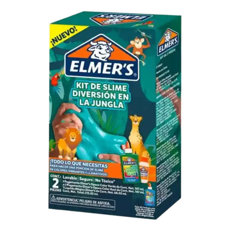 Por tu compra recibe: Kit Slime Elmers Plastilin Diversion Jungla Niño Niña Cantidad: 1 Caja Contenido cada caja: 2 piezas (1 pegamento Verde / Azul + 1 liquido magico) Lavable - Seguro - NO toxico Calidad 100% garantizada Recuerda que somos Mercado Lideres Compra seguro