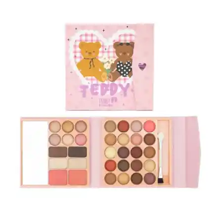 ¡Esta es la paleta de rostro más tierna de Trendy! Paleta Cartera Teddy. Trae 26 sombras para ojos. Tonos tierra entre cafés, dorados y rosados. 11 sombras satinadas y 15 con acabado mate. Incluye 2 rubores mate en tono rosado. Tiene 2 iluminadores, 1 champaña y 1 en dorado. Contiene 2 pigmentos en polvo para cejas. Viene con una brocha pequeña y espejo HD.