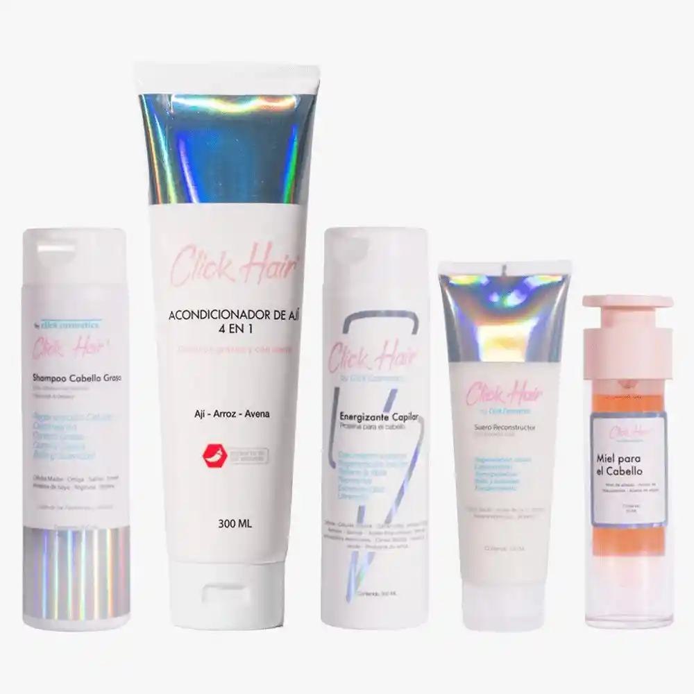Shampoo: células madres, aceleradores metabólicos y carga de vitaminas para un crecimiento saludable, folículo fuerte y ultrabillo. Acondicionador: células madres Hidrata intensamente con vitaminas y nutrientes para un cabello largo, ultrabrillante y sedoso. 🌻 Energizante capilar: mascarilla multivitaminica especie de Red Bull para el cabello acelera la regeneración celular, crecimiento y brillo espejo. Suero reconstructor: contiene coco y proteína hidrolizada protege de los rayos UV, calor, polución externa y deshidratación. Miel para el cabello: a base de miel natural regenera la fibra capilar, sella puntas y aporta brillo espejo. La noche previa o una hora antes del lavado, aplica tu ENERGIZANTE CAPILAR de medios a puntas. Lava con tu SHAMPOO CLICK. Utiliza ACONDICIONADOR CLIK. Utiliza tu SUERO RECONSTRUCTOR puedes usarlo con el cabello húmedo o seco o antes de exponer tu cabello al sol o altas temperaturas. Aplica tu MIEL PARA EL CABELLO para dar acabado a tus peinados o en cualquier momento del día para aportar brillo y suavidad. REPOLARIZACIONES: Cada 8 días después del shampoo aplica tu MIEL PARA EL CABELLO junto tu ENERGIZANTE CAPILAR, envuelve tu plancha para el cabello con papel aluminio y planchalo con el producto aplicado, otra opción son los gorros térmicos de luz, enfría tu cabello y enjuaga.