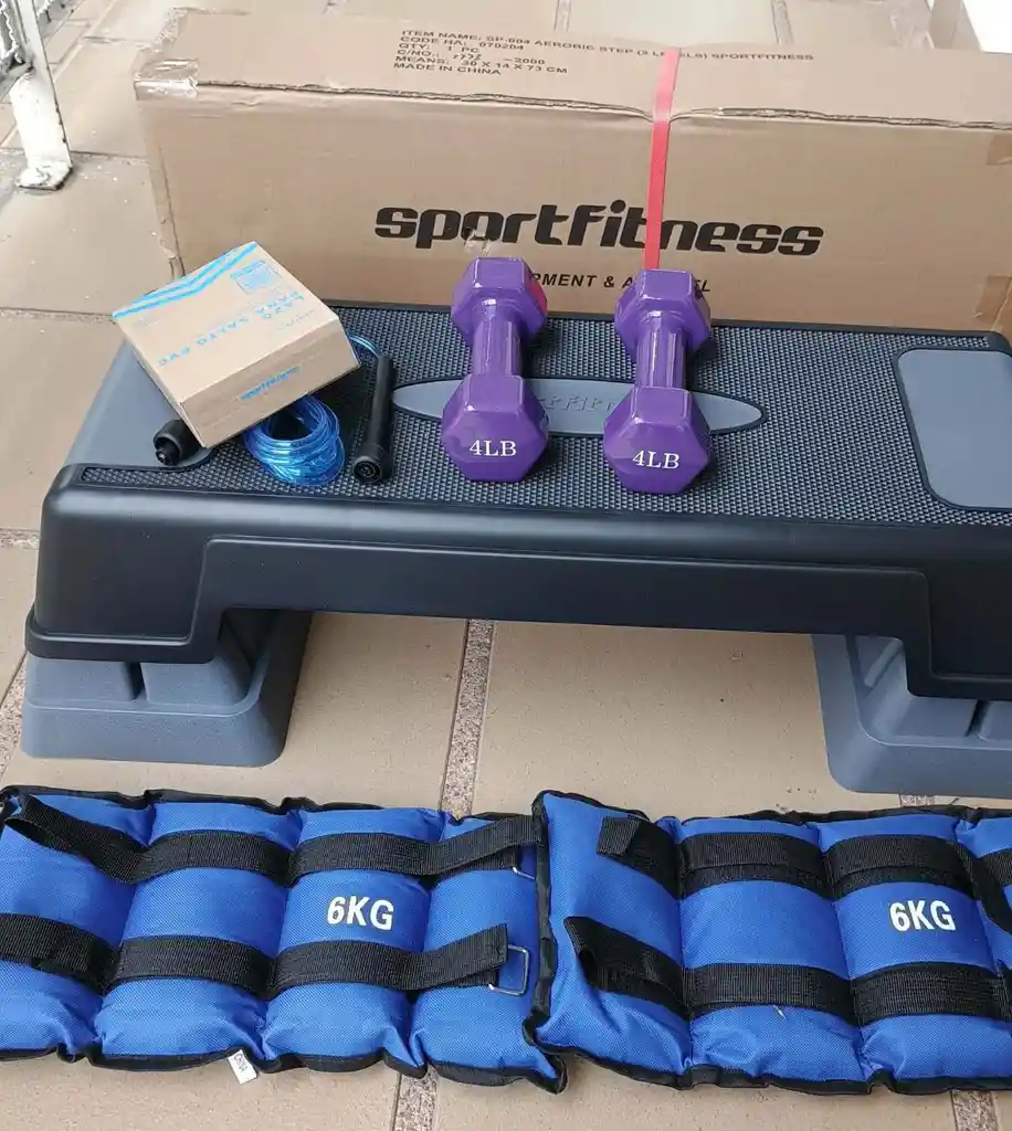 Kit súper económico entreno en casa step sport Fitness 3 niveles Tobilleras de 6 kg Cuerda de saltar sport fitness Mancuerna en vinilo de 4 libras
