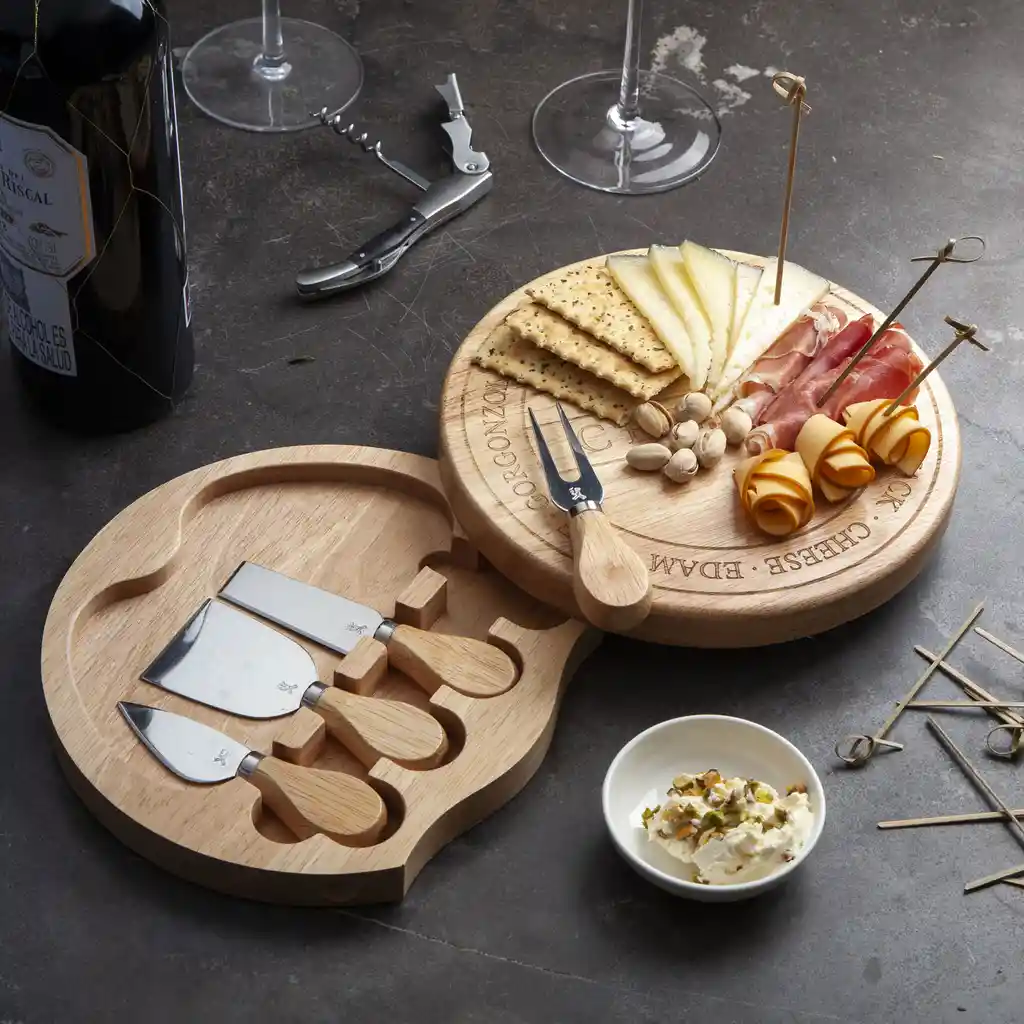 Set especial conformado por un Set para quesos redondo x4 + Pinchos en Bambú + Platico para salsas Esta tabla de queso trae en su interior un completo sets de cuchillos para el queso, cada uno con una función especial. El cuchillo plano es usado para cortar queso suave desmenuzable o para rallar, para hacer virutas o cubos. El punzón es un cuchillo multi-propósito. Es perfecto para separar la cubierta dura de los quesos, hacer cortes en grandes trozos y cortar en pequeños cuadritos para picar. La pala para esparcir Ideal para untar quesos suaves en galletas u otro acompañante. El tenedor se usa para sostener un bloque de queso mientras se corta o taja con un cuchillo. Ideal para cortar quesos madurados y deshacer quesos desmenuzables. Los Pinchos en bambú son una alternativa amigable con el medio ambiente y muy original, para decorar cocteles y ofrecer entremeses en eventos formales e informales. El bambú es una madera renovable y 100% biodegradable que no genera contaminación. Además, por ser natural y orgánico, está libre de sustancias químicas y toxinas nocivas para la salud. El Platico en porcelana de 55 ml, sirve para servir porciones individuales de salsa, aceite, vinagre, mantequilla y otros alimentos que se consumen en pequeña cantidad. Puede usarse en cualquier ocasión pues combina perfecto con otras formas, patrones y texturas de vajillas. Es durable, resistente, y no absorbe olores ni sabores. Soporta las temperaturas del microondas sin romperse. País de origen: China. Importador: Distribuidora Matec S.A.S