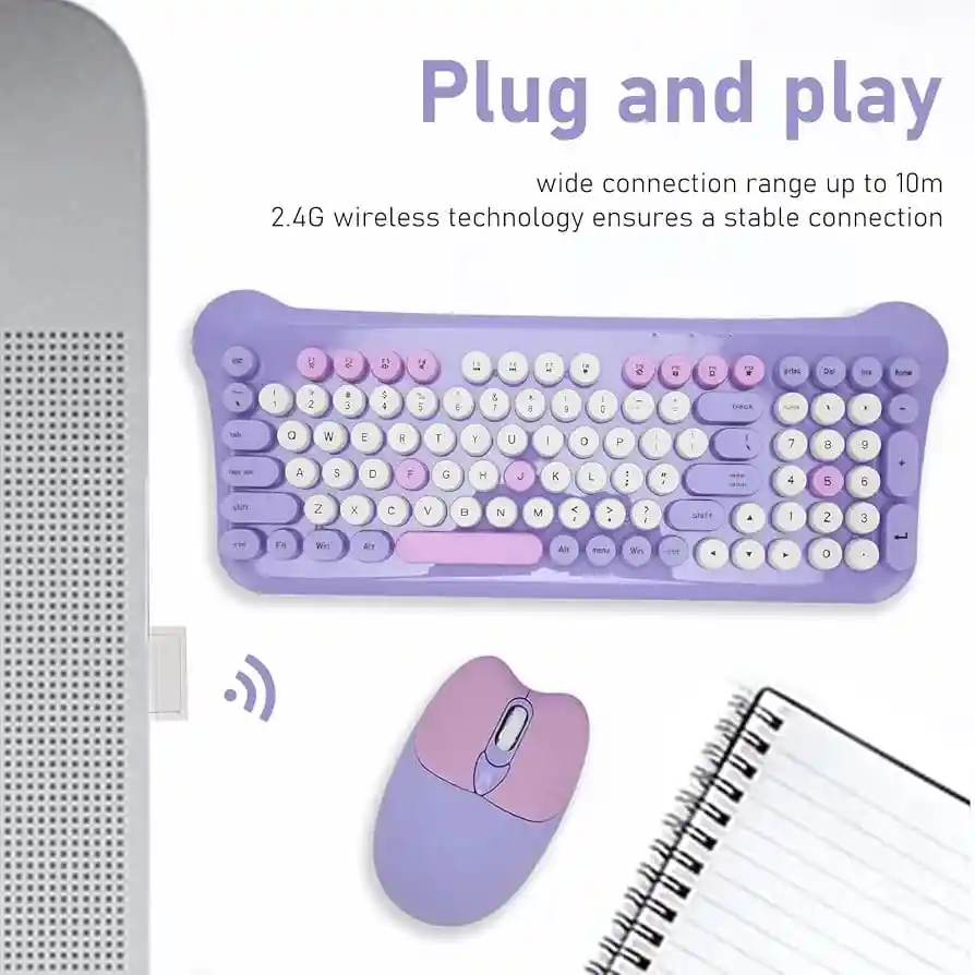El Kit Teclado Inalámbrico + Mouse AOAS AS-212 combina diseño moderno, funcionalidad y comodidad en un elegante color rosado. Su teclado de teclas redondeadas ofrece una escritura suave y silenciosa, ideal para largas jornadas de trabajo, estudio o uso diario en el hogar u oficina. El mouse inalámbrico ergonómico brinda un manejo preciso y cómodo, permitiendo libertad de movimiento sin cables. Ambos dispositivos funcionan mediante receptor USB, lo que garantiza una conexión estable y rápida, compatible con computadores y portátiles. Perfecto para quienes buscan un espacio de trabajo práctico, ordenado y con un toque estético moderno. Características principales: Kit inalámbrico: teclado + mouse Conexión mediante receptor USB Teclas redondeadas para escritura cómoda Mouse ergonómico y ligero. •Diseño moderno en color rosado Ideal para oficina, estudio y uso en casa. •Incluye únicamente teclado, mouse y receptor USB. Los demás elementos son solo ambientación. Tonos: Lila