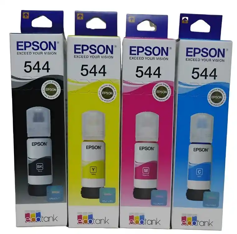 Kit de 4 Tintas Epson 544 Original (Negro, Cian, Magenta y Amarillo). Diseñado para equipos EcoTank,