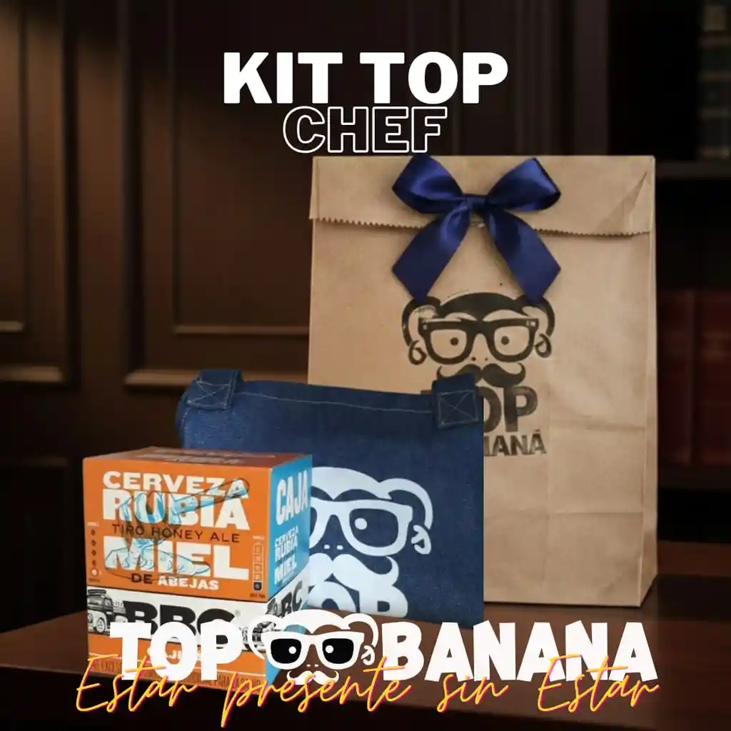 Kit compuesto por un delantal en Jean con bolsillo y porta trapo con una 4pack de Cerveza en lata Miel de BBC X 269ml cada una, todo empacado en bolsa de papel Kraft con lazo azul oscuro y tarjeta personalizada de Top Banana.