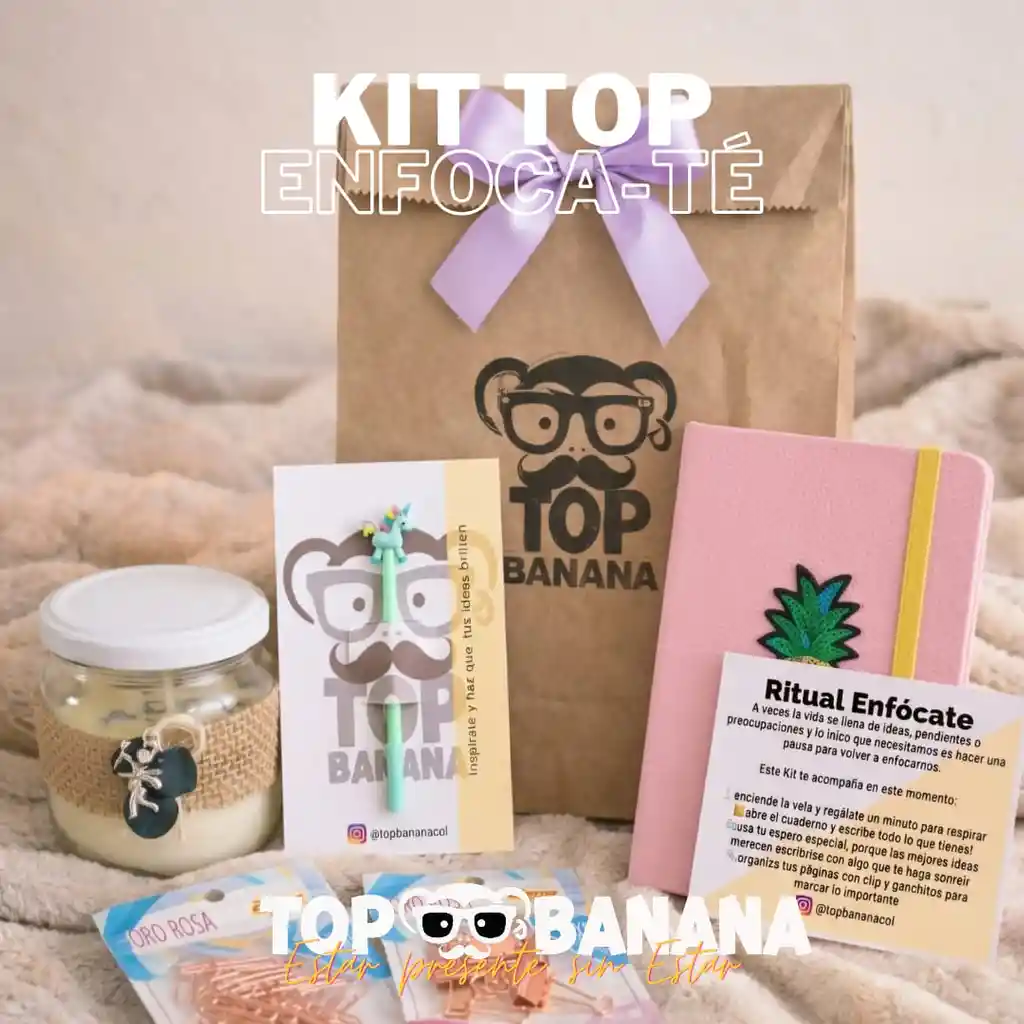 Regala un momento de conexión con este Kit Top Enfócate para esas personas que necesitan un alto en el camino y creer en su poder, una libreta poderosa color rosa con piña en lentejuelas con terminado peludo, un esfero de unicornio para escribir tus ideas, un set de ganchitos y clips color oro rosa para marcar tus importantes, una vela de soya para masajes con olor relajante perdurable para que te des una pausa y dejes volar tu imaginación con una tarjeta personalizada del ritual y todo empacado en nuestra tradicional bolsa en papel Kraft de Top Banana con lazo lila.