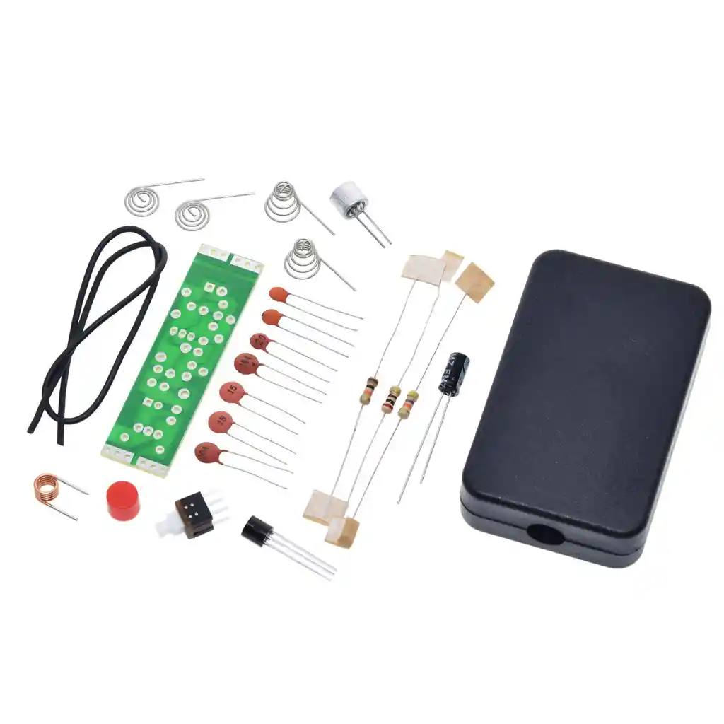 La frecuencia del transmisor por defecto es 70MHz. Ajuste L1 para ajustar la frecuencia de disparo. Cuando haya terminado de soldar, puede hacer un pequeño ajuste para recibir la radio normal. Este es un kit de bricolaje, necesitas ensamblarlo. Consejos: Debido a que el circuito de este kit es simple, la frecuencia de emisión se ve muy afectada por el medio ambiente, tocar o cerca de la placa de circuito, la antena o la carcasa puede provocar cambios en la frecuencia de transmisión, se puede utilizar como modelo del modelo de lanzamiento, no recomendado para uso industrial o comercial. Característica: Nombre del paquete: transmisor de FM Modelo del kit: RF-01 Voltaje de funcionamiento: 1,5 V (batería AAA * 2) o DC3-6V (la batería no incluye) Corriente de funcionamiento: 5 mA (3 V) - 10 mA (6 V) Rango de frecuencia: 70-110 MHz Distancia de lanzamiento: 5-30 metros (afectado por el nivel de producción y el uso del medio ambiente) Longitud de la antena: cable blando de 200 mm Sensibilidad: se puede recibir un rango de voz de 1 metro Caja de batería: si Tamaño de PCB: 49 * 13 mm Dimensiones: 55 * 35 * 15 mm Peso del paquete: 18g LA COMPRA INCLUYE: **** PILAS NO INCLUIDAS*** 1 x KIT TRANSMISOR RADIO FM RF-01 70MHz 3-6V 5-30mt