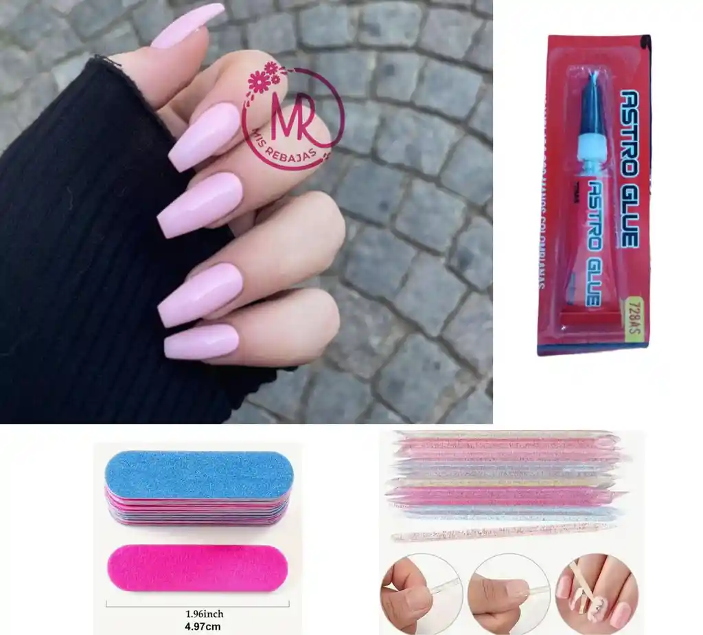 Incluye: Set 24 unidades de uñas postizas+ adhesivo instantáneo+palito de cristal+ mini lima. Puedes colocarles stickers, piedras o cualquier tipo de decoración para personalizarlas. Se pueden aplicar con cualquier sistema press on. Se pueden aplicar con adhesivo para uñas. Modo de uso: Preparar la uña natural haciendo una buena limpieza, retirando residuos de cualquier producto, luego limar en una sola dirección suavemente la uña natural para abrir canales de adherencia y para retirar su brillo natural, si desea puede aplicar primer para uñas (opcional) para asegurar el anclaje de la uña y que las uñas postizas le demoren por más tiempo. Luego aplicar una gota de adhesivo en la uña postiza, esperar unos segundos y aplicar la uña postiza en la uña natural haciendo leve presión y listo. Tratar de no mojarse las manos por lo menos durante una hora.