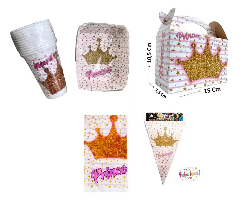 Kit Vasos Paltos Princes, Contiene 12 Vaso Desechable Plastico Niña Princess 6 Oz, 12 Plato Para Torta Niña Princess, 6 Caja Dulcera Para Sorpresa Fiesta Motivo Princes