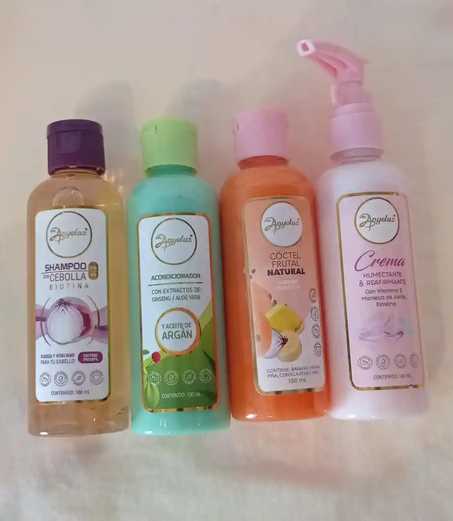 Kit viajero marca Anyeluz. Contiene: 1. Shampoo de Cebolla por 100ml. 1. Acondicionador con extracto de ginseg / aloe vera y aceite de Argán por 100ml. 1. Coctel de frutas a base de banano, papaya, piña, cebolla roja y miel por 100ml 1. Crema humectante y reafirmante con Vitamina E, manteca de kerité y Elastina por 100ml.