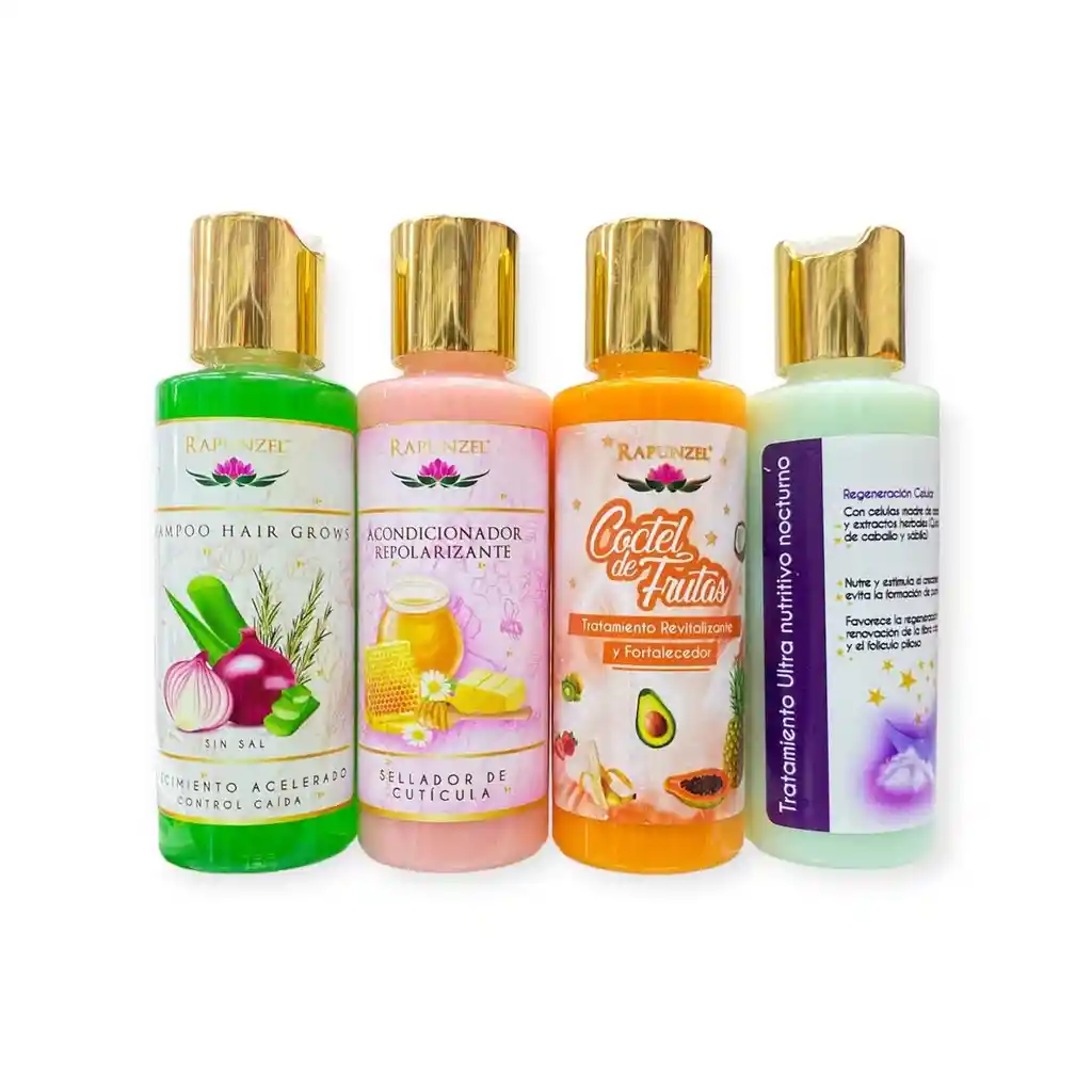 Kit viajero con 4 productos de 130ml cada uno: Shampoo cebolla crecimiento, acondicionador repolarizante, tratamiento coctel de frutas y tratamiento nocturno. Ideal para llevar contigo y cuidar tu cabello donde quieras.