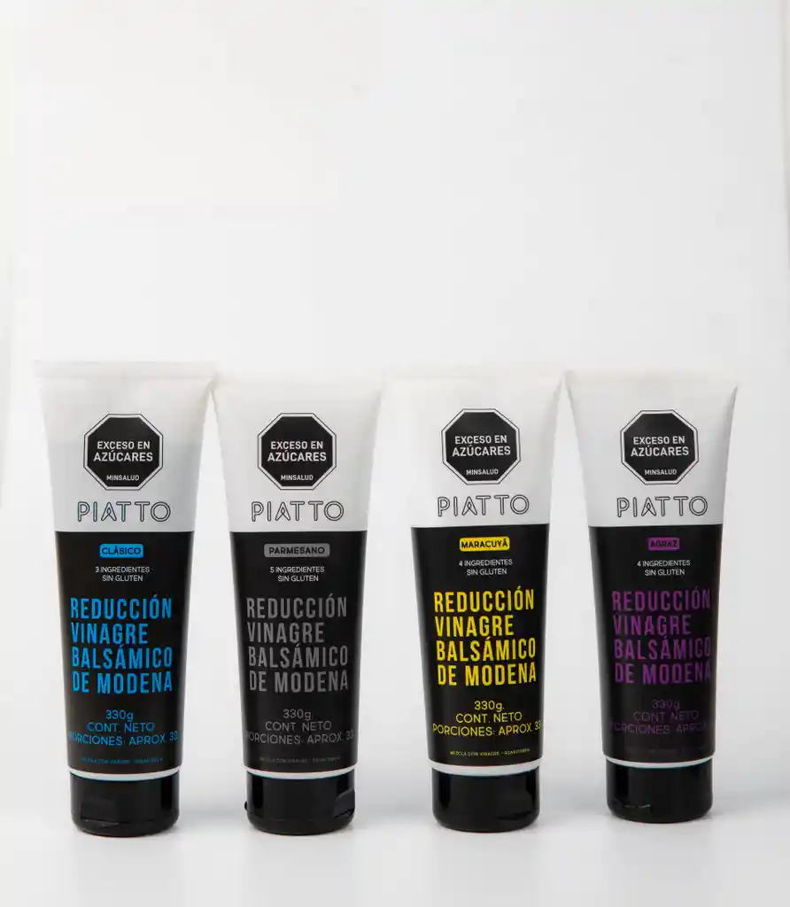 Kit de 4 sabores de reducción PIATTO Agráz, maracuyá, parmesano, y clásico. Ideales para ensaladas, pastas, carnes, pizzas y muchas preparaciones más