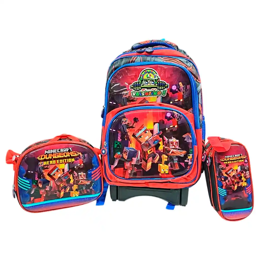 Kit morral mochila con rueda + lonchera + cartuchera Minecraft. Tamaño oficio en doble llanta en silicona. Material lona poliéster impermeable. Compartimentos de gran capacidad. Dos bolsillos laterales en malla. Varilla en aluminio automática. Correa y espaldar acolchado. Medidas Morral: 45 cm de alto x 30 cm de ancho. Lonchera: 23cm de ancho x 20 cm de alto. Cartuchera: 22cm de ancho x 10 cm de alto x 5 cm de profundidad.