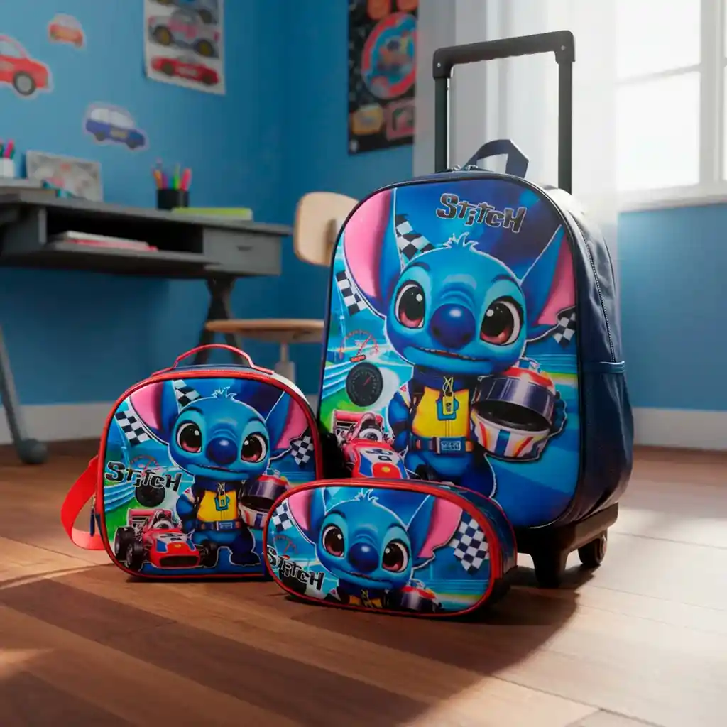 Kit 3 en 1 Mochila con Ruedas + Lonchera + Cartuchera de Personajes ¡El combo ideal para acompañar a los más pequeños en su día a día! Este kit reúne funcionalidad, resistencia y diseño divertido, perfecto para el colegio, viajes o actividades recreativas. Incluye: Mochila con ruedas tamaño carta: práctica y ligera, con llanta siliconada para un deslizamiento suave. Lonchera térmica: mantiene los alimentos frescos y seguros. Cartuchera amplia: espacio perfecto para lápices, colores y accesorios escolares. Características destacadas: Material: lona poliéster impermeable, resistente al uso diario. Compartimento principal de gran capacidad. Dos bolsillos laterales en malla para botellas o accesorios. Varilla en aluminio automática para mayor comodidad. Correas y espaldar acolchados que brindan confort al cargar. Medidas: Mochila: 35 cm alto x 25 cm ancho Lonchera: 23 cm ancho x 20 cm alto Cartuchera: 22 cm ancho x 10 cm alto x 5 cm profundidad Ideal para regalar, para el regreso a clases o para que los niños disfruten de sus personajes favoritos con estilo y practicidad.