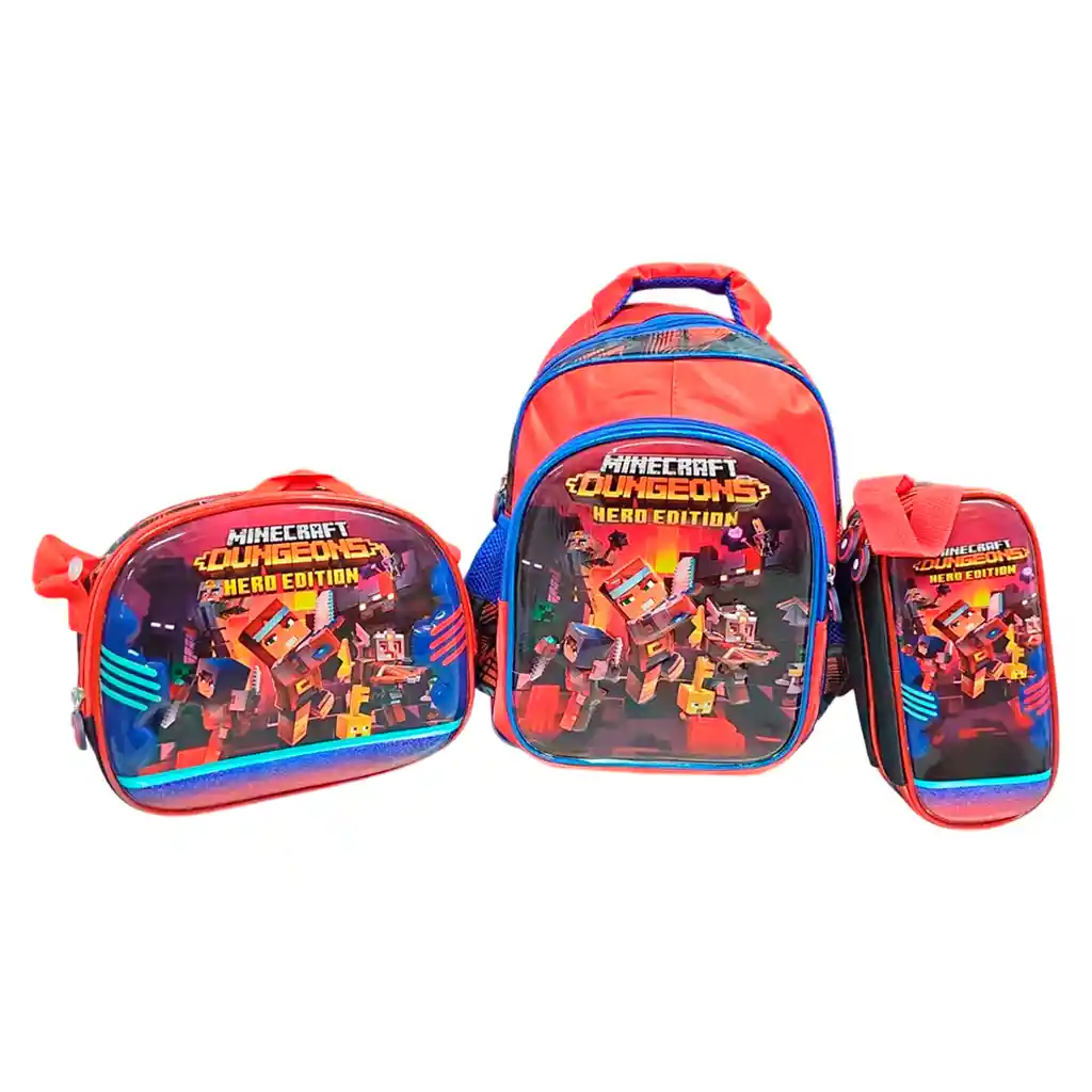 Kit morral maleta + lonchera + cartuchera Minecraft Morral tamaño Carta Material lona poliéster impermeable Compartimentos de gran capacidad Dos bolsillos laterales en malla Correa y espaldar acolchado Medidas Morral: 37 cm de alto x 32 cm de ancho Lonchera: 23cm de ancho x 20 cm de alto Cartuchera: 22cm de ancho x 10 cm de alto x 5 cm de profundidad