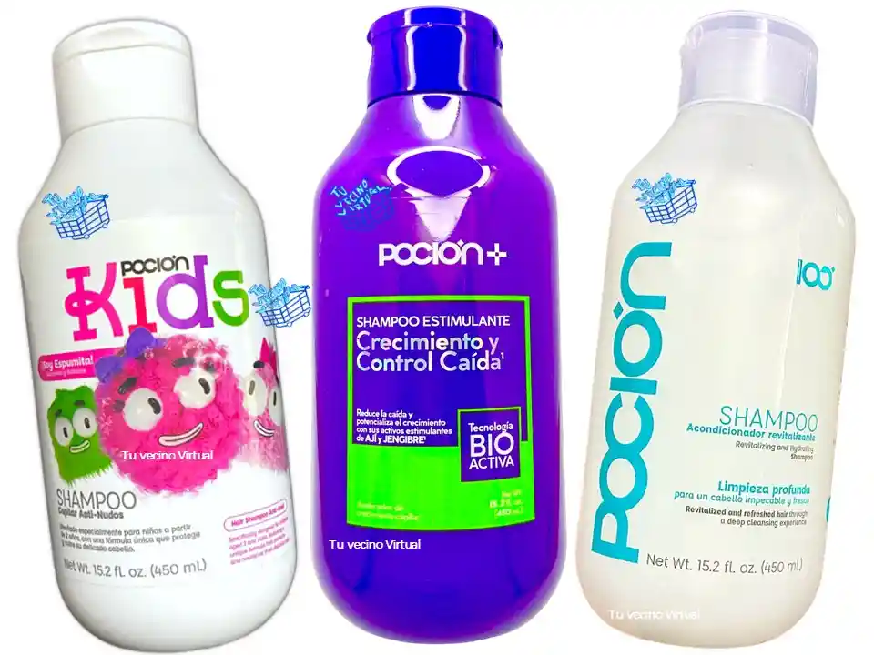 En tu vecino virtual también encontraras : Anyeluz, syam cosmetic, piel de oro, Kaba, class gold, lampiña, Te verde de matcha Benefit, te plus, te latte, te negro, exfoliante, aceite de coco, pomada alfa, colageno hidrolizado,vinipel osmótico, Bioaqua Acne, Mascarillas,tónico, Trendy, la pocion, HGW y muchos mas ————————————————————————————————————————————————— Shampoo la poción Shampoo sin sal, fortalece y regenera la fibra capilar, limpia el cabello sin maltratarlo. Gracias a sus ingredientes activos ayudan a mantener el cabello sano. Diseñado especialmente para cabellos maltratados, y alisados. Contiene : 450 mL Invima :NSOC13719-22CO ______________________________________________________________ Shampoo Crecimiento y Control Caida Shampoo Estimulante Crecimiento y Caída con tecnología bioactiva y alto índice de biodegradabilidad. La mezcla única de ingredientes naturales de Ají, Jengibre y Trébol Rojo revitaliza los folículos capilares desde la raíz, acelerando las fases de crecimiento capilar asegurando así, un crecimiento continuo y robusto al mismo tiempo que combate y detiene la caída del cabello. Modo de uso: Humedece el cabello, aplica y distribuye sobre el cuero cabelludo realizando masajes circulares con la yema de los dedos, enjuaga y repite el proceso de ser necesario Contenido : 450 mL _________________________________________ ———————————————————————————————————— SHAMPOO Capilar Anti-Nudos Diseñado especialmente para niños a partir de dos años con una fórmula única que protege y nutre su delicado cabello. Shampoo capilar POCIÓN KIDS, brinda una limpieza suave y segura que mantiene el equilibrio natural del cuero cabelludo sin alterar su pH gracias a sus delicados agentes limpiadores. Su fórmula, libre de sulfatos, parabenos y sal', garantiza una limpieza sin irritación mientras hidrata, fortalece y nutre el cabello a través de sus iingredientes naturales. MODO DE USO: Humedece el cabello, aplica y distribuye sobre el cuero cabelludo realizando masajes circulares con la yema de los dedos, enjuaga y repite el proceso en caso de ser necesario. PRECAUCIONES: Solo para uso externo. Evitar el contacto con los ojos, en tal caso, enjuagar con abundante agua. Suspenda su uso si observa alguna. reacción desfavorable, si esta persiste, consulte a un médico. ADVERTENCIAS: Mantener fuera del alcance de los niños. Conservar en un lugar fresco, seco y protegido de la luz.