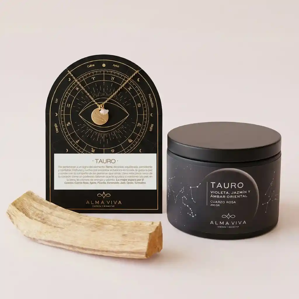 Kit collar Constelación piedra Cuarzo Rosado Vela a base de cera de soya y cera convencional Fragancia: Violeta, Jazmin y Ambar Oriental