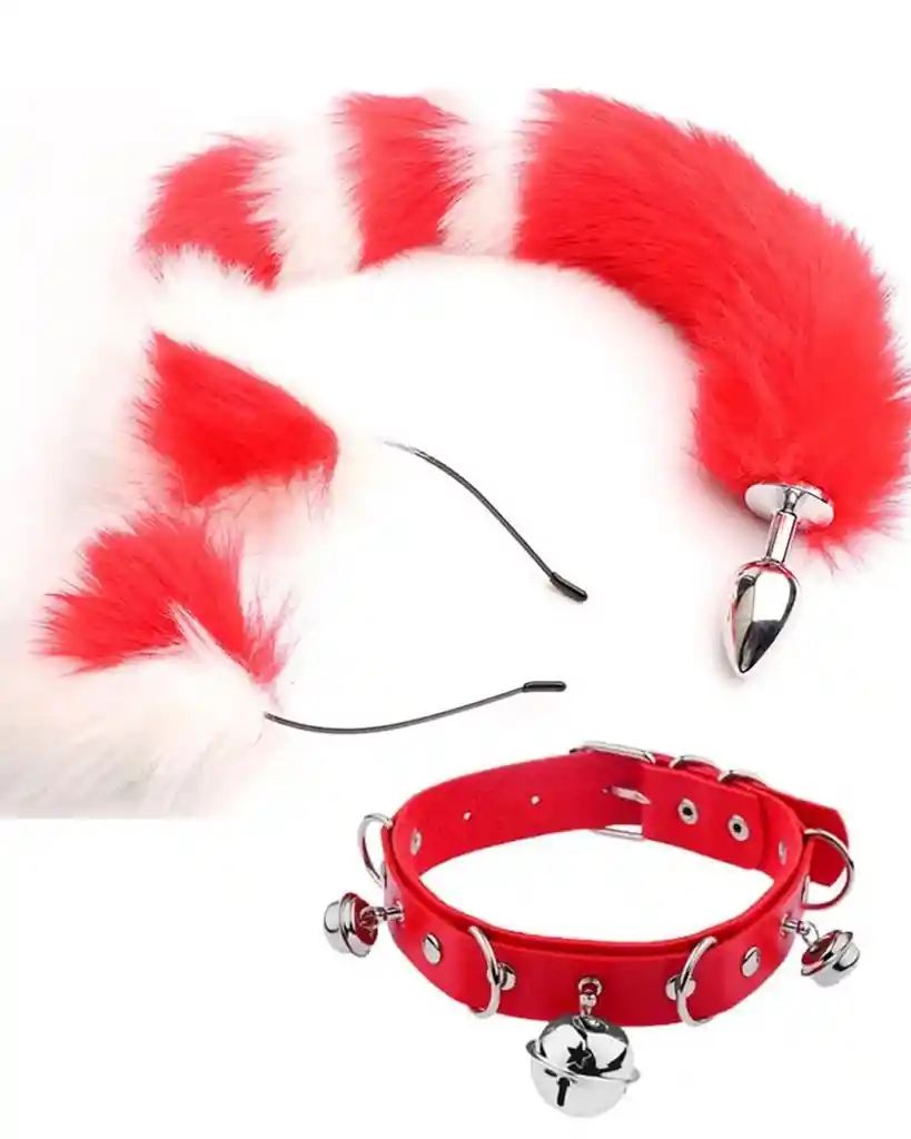 Kit para videos o fantasías COLOR: Rojo Con Blanco Incluye: • Cola de Zorro • Orejas • Collar con Campana