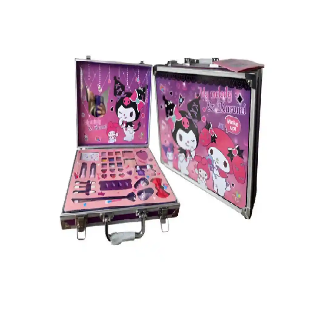 Sorprende a las niñas con este exclusivo Set de Maquillaje Infantil My Melody & Kuromi, un maletín completo, resistente y lleno de colores diseñado para estimular la creatividad y el juego imaginativo. Su diseño inspirado en personajes adorados lo convierte en un complemento ideal para juegos de salón de belleza, fiestas y actividades creativas. Descripción del Producto Este maletín incluye una amplia variedad de sombras, brillos, labiales, esmaltes y accesorios infantiles elaborados con fórmulas seguras, lavables y no tóxicas. El estuche rígido tipo profesional brinda una experiencia auténtica de maquillaje, ofreciendo orden, protección y estilo en un solo producto. Características Principales Maletín rígido tipo profesional con diseño My Melody & Kuromi. Amplia paleta de sombras en tonos rosados, morados y neutros. Brillos labiales suaves de fácil aplicación. Esmaltes infantiles lavables. Brochas, aplicadores y accesorios para completar el look. Espejo integrado para mayor realismo en el juego. Fórmula no tóxica y apta para pieles delicadas. Organización interna por compartimientos para mantener todo en orden. Ideal como regalo para niñas amantes del maquillaje y los personajes animados. Forma de Uso Abrir el maletín y seleccionar los productos deseados. Aplicar el maquillaje con las brochas y aplicadores incluidos. Retirar fácilmente con agua y jabón después del juego. Guardar nuevamente los accesorios en su lugar para prolongar la vida útil del set. Recomendaciones de Uso Utilizar bajo supervisión de un adulto en niñas pequeñas. Evitar el contacto directo con ojos y boca en exceso. Realizar una prueba en una pequeña zona de la piel si es la primera vez que se usa. Mantener el maletín cerrado y almacenado en un lugar seguro. Condiciones Óptimas de Conservación Guardar en un ambiente fresco y seco. Mantener alejado de fuentes de calor o exposición solar prolongada. Limpiar brochas y aplicadores después de cada uso para evitar acumulación de residuos.
