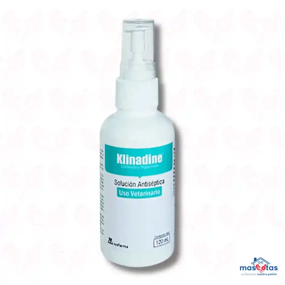 Klinadine es un antiséptico veterinario de amplio espectro a base de clorhexidina, diseñado para la limpieza y desinfección de heridas, infecciones cutáneas (piodermas), y cuidado bucal en perros, gatos y otras especies. Actúa rápidamente como bactericida y fungistático sin irritar la piel, siendo ideal para uso dermatológico y quirúrgico. Características y Usos Principales: Acción: Antiséptico local inmediato con efecto bactericida y fungistático. Indicaciones: Limpieza y desinfección de heridas, quemaduras, úlceras cutáneas, raspaduras y picaduras. Uso Veterinario: Seguro para perros, gatos, roedores, conejos y hurones; ideal para la desinfección de patas y piel. Aplicación: Tópica mediante atomizador (spray) o gasa. Presentación: Generalmente en frasco con atomizador de 60 o 120ml Precauciones: Uso externo únicamente. Evitar el contacto con ojos y oídos. Puede teñir temporalmente el pelaje de la mascota