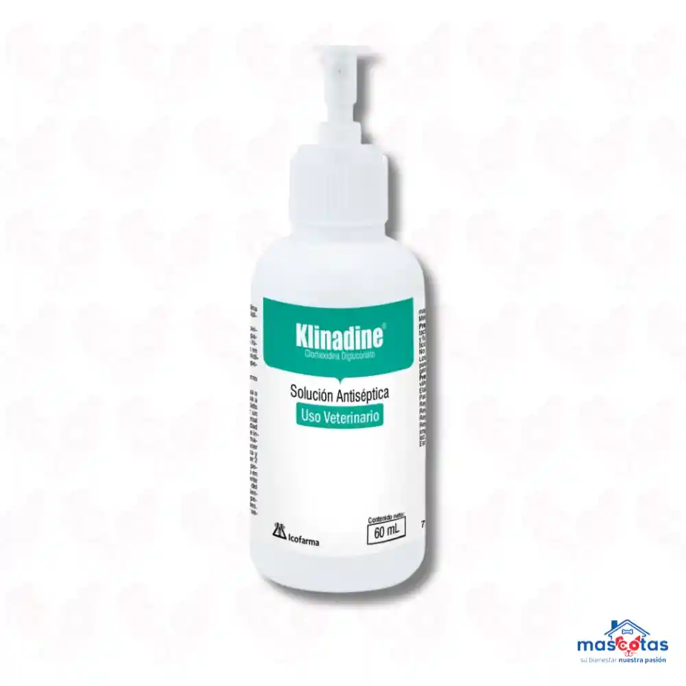 Klinadine es un antiséptico veterinario de amplio espectro a base de clorhexidina, diseñado para la limpieza y desinfección de heridas, infecciones cutáneas (piodermas), y cuidado bucal en perros, gatos y otras especies. Actúa rápidamente como bactericida y fungistático sin irritar la piel, siendo ideal para uso dermatológico y quirúrgico. Características y Usos Principales: Acción: Antiséptico local inmediato con efecto bactericida y fungistático. Indicaciones: Limpieza y desinfección de heridas, quemaduras, úlceras cutáneas, raspaduras y picaduras. Uso Veterinario: Seguro para perros, gatos, roedores, conejos y hurones; ideal para la desinfección de patas y piel. Aplicación: Tópica mediante atomizador (spray) o gasa. Presentación: Generalmente en frasco con atomizador de 60 o 120ml Precauciones: Uso externo únicamente. Evitar el contacto con ojos y oídos. Puede teñir temporalmente el pelaje de la mascota