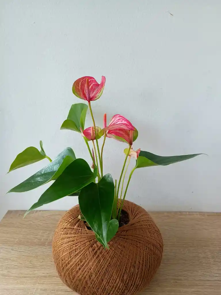 Arte natural que sorprende. Anturio bicolor en kokedama de hilo artesanal. 40cm. Flores unicas rojo-verde. Purifica aire. Facil cuidado