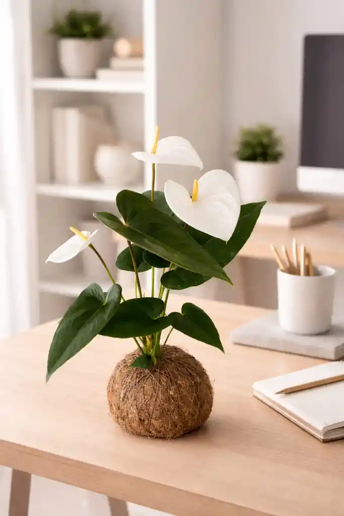 Anturio blanco en kokedama, incluye decoración y mensaje personalizado. Puedes dejar tus mensajes en el chat del RT, nosotros los veremos. IMAGEN DE REFERENCIA