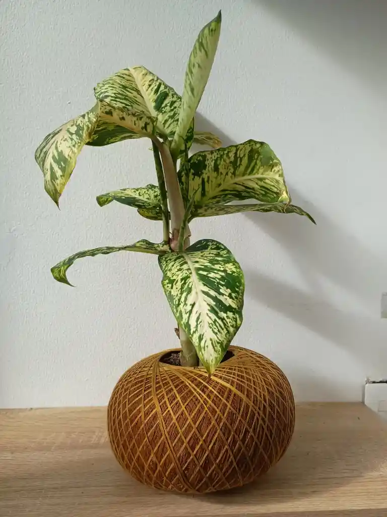 Planta Dieffenbachia de hojas grandes, verdes y jaspeadas en tonos crema, cultivada en kokedama artesanal envuelta con hilo dorado que resalta su belleza tropical. Perfecta para decorar salas, oficinas o como regalo original y elegante.