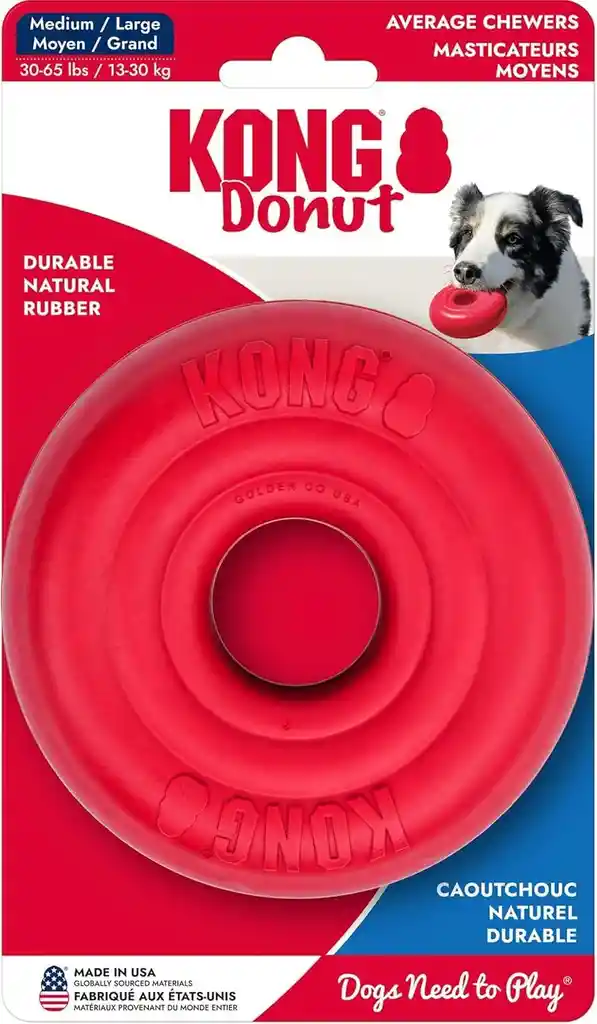 Goma natural duradera para masticar sin fin: el juguete para perros KONG Donut está hecho de goma natural de alta calidad que resiste horas de masticación mientras se mantiene suave con los dientes y las encías, por lo que es una alternativa más segura al nailon, plástico duro, palos o huesos Promueve la salud dental y el cuidado de las encías: a diferencia de los juguetes que astillan o dañan los dientes, esta dona de goma ayuda a masajear las encías y limpiar los dientes con cada masticación, fomentando hábitos saludables de masticación mientras reduce el comportamiento destructivo en la casa Divertida forma de rosquilla para buscar y jugar: el diseño único de dona añade una acción impredecible de rebote y rollo, manteniendo a los perros activos, entretenidos y estimulados mentalmente durante las sesiones de juego en interiores o exteriores, haciendo que buscar sea más emocionante y divertido Seguro y suave para todos los tamaños de perro: perfecto para razas pequeñas, medianas y grandes, este juguete es fuerte pero lo suficientemente suave como para ser seguro para el juego diario, proporcionando diversión duradera mientras garantiza que tu cachorro pueda masticar sin riesgo de bordes afilados o astillas Gran opción para masticadores de potencia también: mientras que el KONG Donut es resistente, los perros que necesitan un juguete aún más fuerte pueden actualizarse al KONG Extreme Donut, hecho de nuestra goma más duradera para soportar a los masticadores más entusiastas y decididos