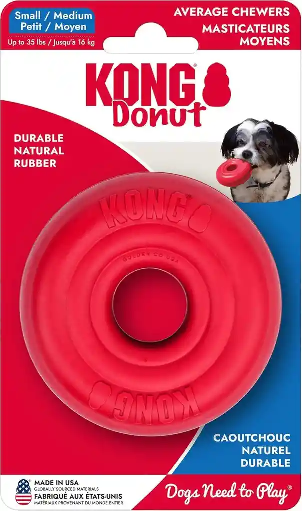 Goma natural duradera para masticar sin fin: el juguete para perros KONG Donut está hecho de goma natural de alta calidad que resiste horas de masticación mientras se mantiene suave con los dientes y las encías, por lo que es una alternativa más segura al nailon, plástico duro, palos o huesos Promueve la salud dental y el cuidado de las encías: a diferencia de los juguetes que astillan o dañan los dientes, esta dona de goma ayuda a masajear las encías y limpiar los dientes con cada masticación, fomentando hábitos saludables de masticación mientras reduce el comportamiento destructivo en la casa Divertida forma de rosquilla para buscar y jugar: el diseño único de dona añade una acción impredecible de rebote y rollo, manteniendo a los perros activos, entretenidos y estimulados mentalmente durante las sesiones de juego en interiores o exteriores, haciendo que buscar sea más emocionante y divertido Seguro y suave para todos los tamaños de perro: perfecto para razas pequeñas, medianas y grandes, este juguete es fuerte pero lo suficientemente suave como para ser seguro para el juego diario, proporcionando diversión duradera mientras garantiza que tu cachorro pueda masticar sin riesgo de bordes afilados o astillas Gran opción para masticadores de potencia también: mientras que el KONG Donut es resistente, los perros que necesitan un juguete aún más fuerte pueden actualizarse al KONG Extreme Donut, hecho de nuestra goma más duradera para soportar a los masticadores más entusiastas y decididos