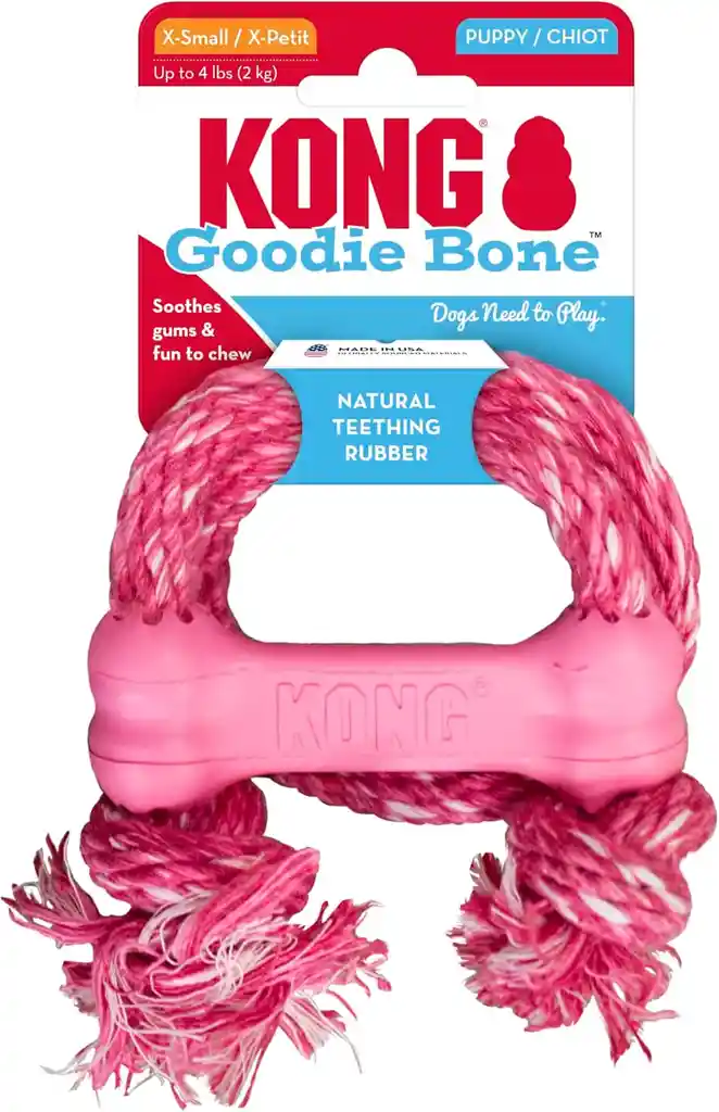 The KONG Goodie Bone™ with Rope es el regalo perfecto para aquellos perros a los que les gusta masticar juguetes y, con su soga de algodón completamente natural, es ideal para satisfacer sus necesidades instintivas. Fabricado con la fórmula exclusiva de caucho rojo completamente natural KONG Classic, este hueso también posee una soga completamente de algodón que le ofrece a su perro diferentes opciones a la hora de masticar. Fabricados con orgullo en EE. UU. Dimensiones del producto: X-Small:17.2 x 8.8 x 2 cm