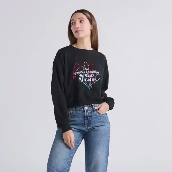 Buzo Mi color - Negro: Buzo negro corto de cuello redondo con cogotera en contraste y manga larga, elaborado en tela tipo waffle. Cuenta con arte en el delantero. Composición: 67% poliéster, 33% algodón. Cuidados: Leer la etiqueta de cuidados antes de lavar.