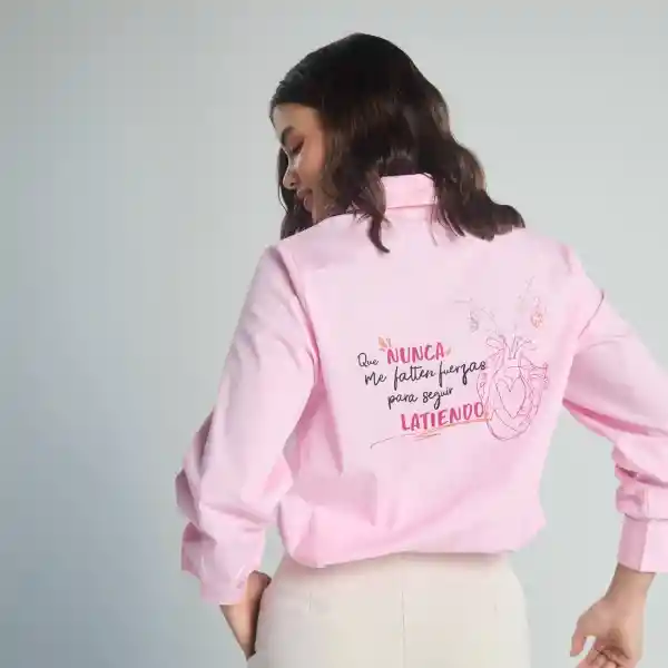 Camisa de color rosado con manga larga, cierre de botones y cuello clásico. Cuenta con un estampado en la espalda y en los puños. La modelo está usando la talla S. Leer la etiqueta de cuidados para el mantenimiento adecuado.